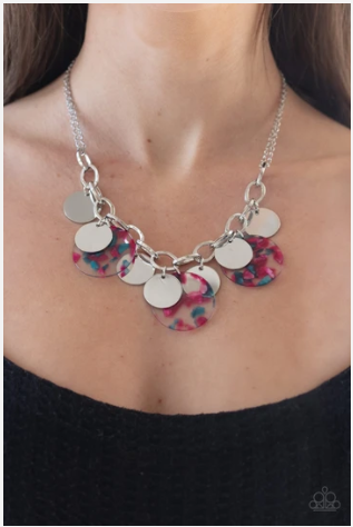 Attached to doubled silver chain, a playful collection of colorful acrylic discs and shiny silver discs swing from the bottom of a bold silver chain, creating a bubbly fringe below the collar. Features an adjustable clasp closure. Color may vary.