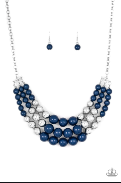 Gradually increasing in size near the center, a collection of blue and silver beads layer below the collar in a statement making fashion. Features an adjustable clasp closure. Sold as one individual necklace. Includes one pair of matching earrings.