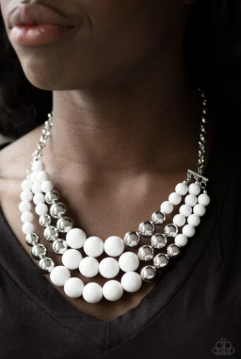 Gradually increasing in size near the center, a collection of white and silver beads layer below the collar in a statement making fashion. Features an adjustable clasp closure.