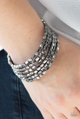 A glistening collection of rectangular gunmetal beads are threaded along a coiled wire, creating a shimmer infinity wrap style bracelet around the wrist.