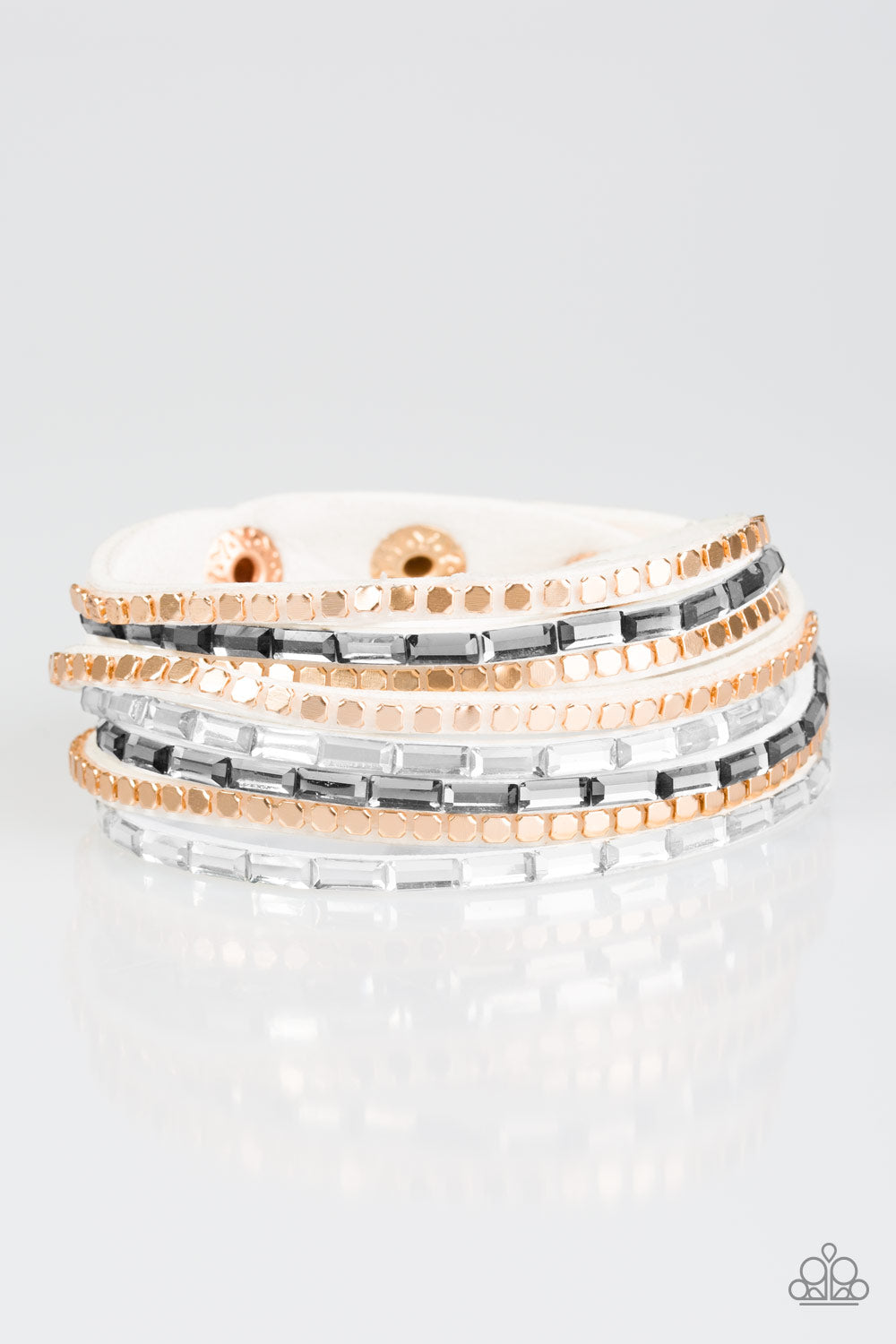 White emerald cut rhinestones and flat silver cube beads are encrusted along strands of suede for a sassy look. The elongated band double wraps around the wrist for a fierce one-of-a-kind look. Features an adjustable snap closure. You can also wear this as a choker.