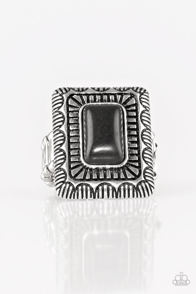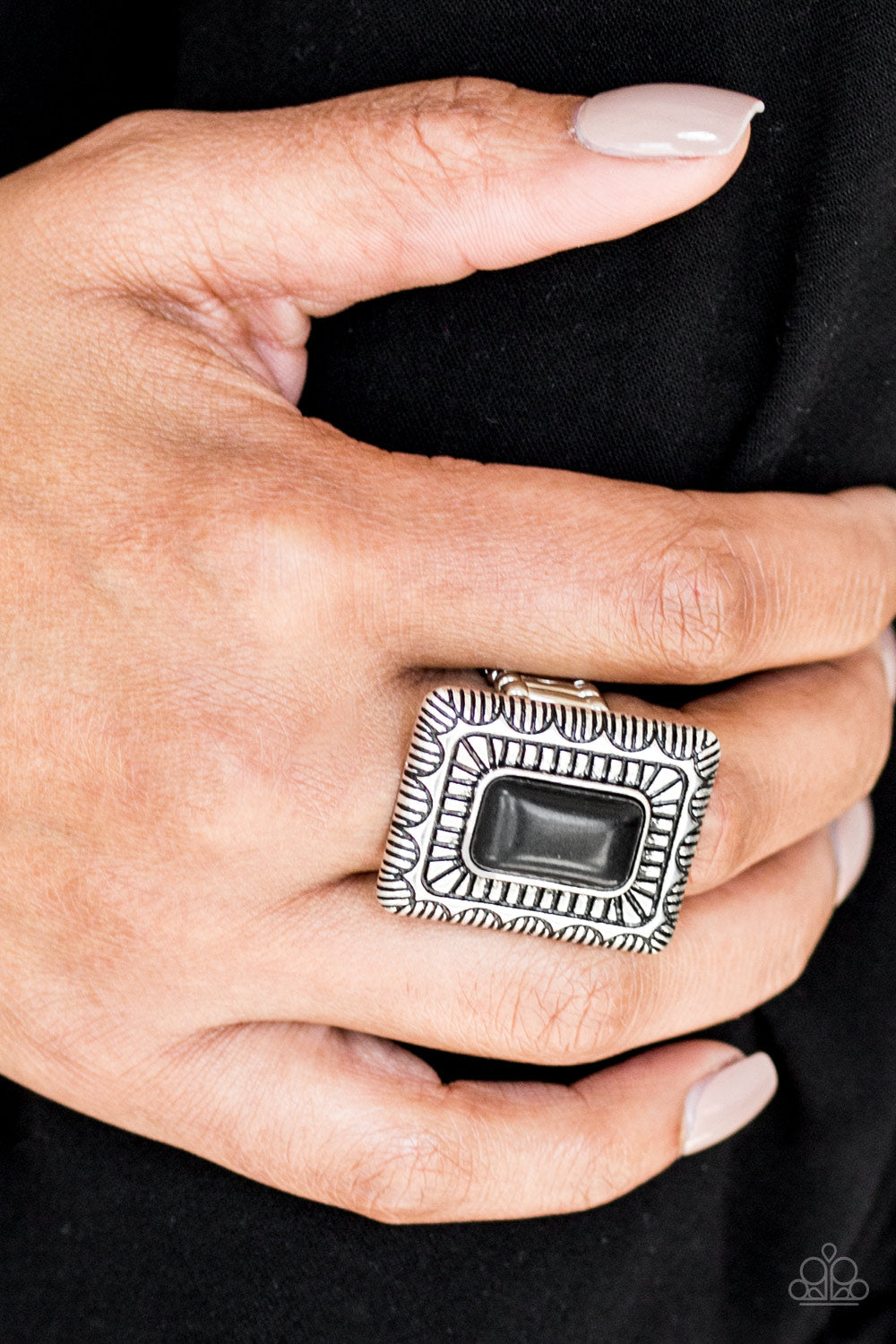 Chiseled into a tranquil rectangle, a refreshing turquoise stone is pressed into a rectangular silver frame radiating with tribal inspired textures for a seasonal look. Features a stretchy band for a comfortable fit.
